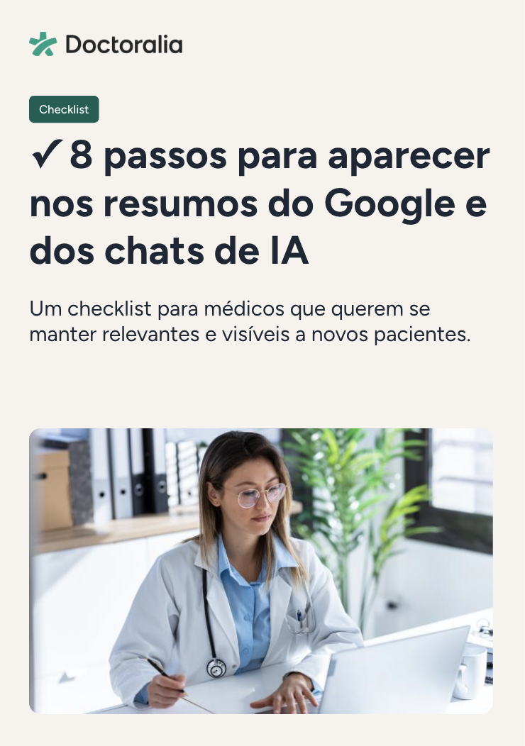 Este é um material para o seu marketing médico. Ele reúne 8 ações práticas para ajudar você a ter mais relevância nos resultados de busca gerados por IA. Aprimore o trabalho que você já vem fazendo para se apresentar a novos pacientes — ou comece agora.